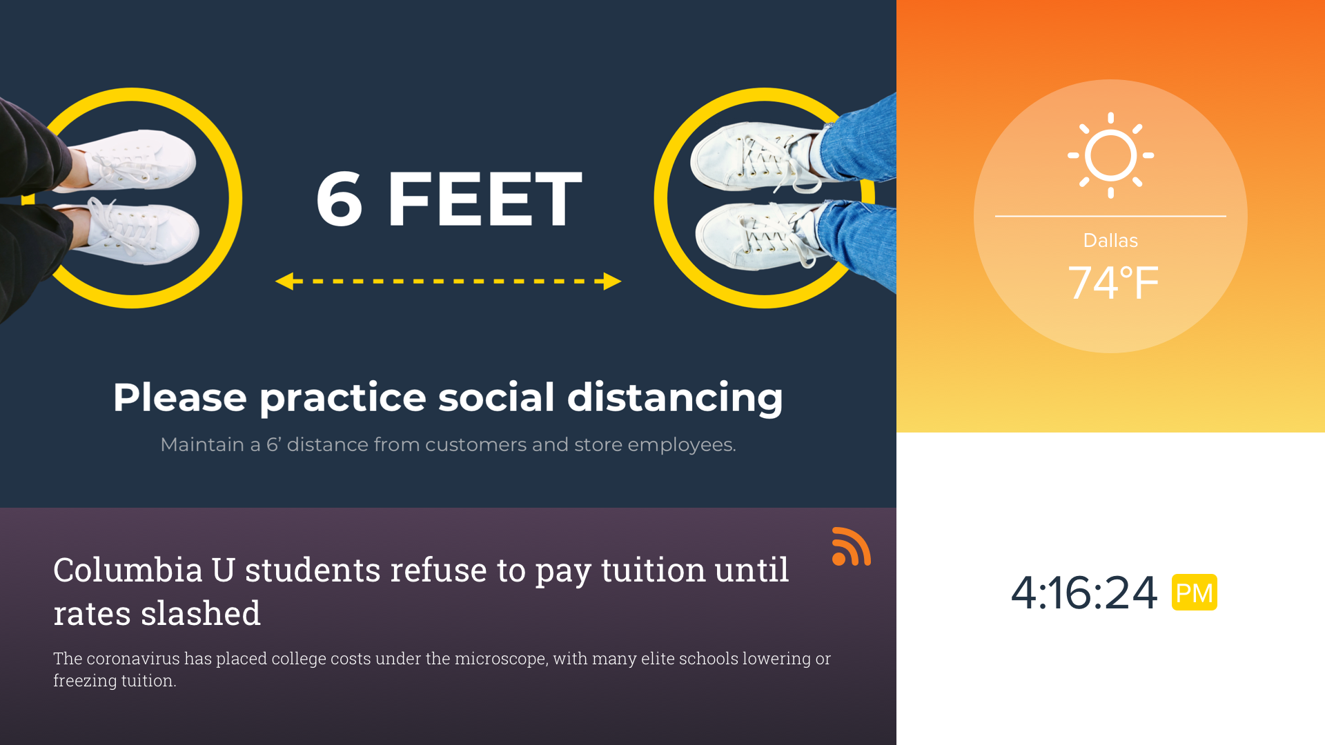 You can add a Banner to show multiple types of content on the left or right side of your digital signage displays. Or, add a Ticker to show a scrolling feed of text content along the top or bottom of your displays.