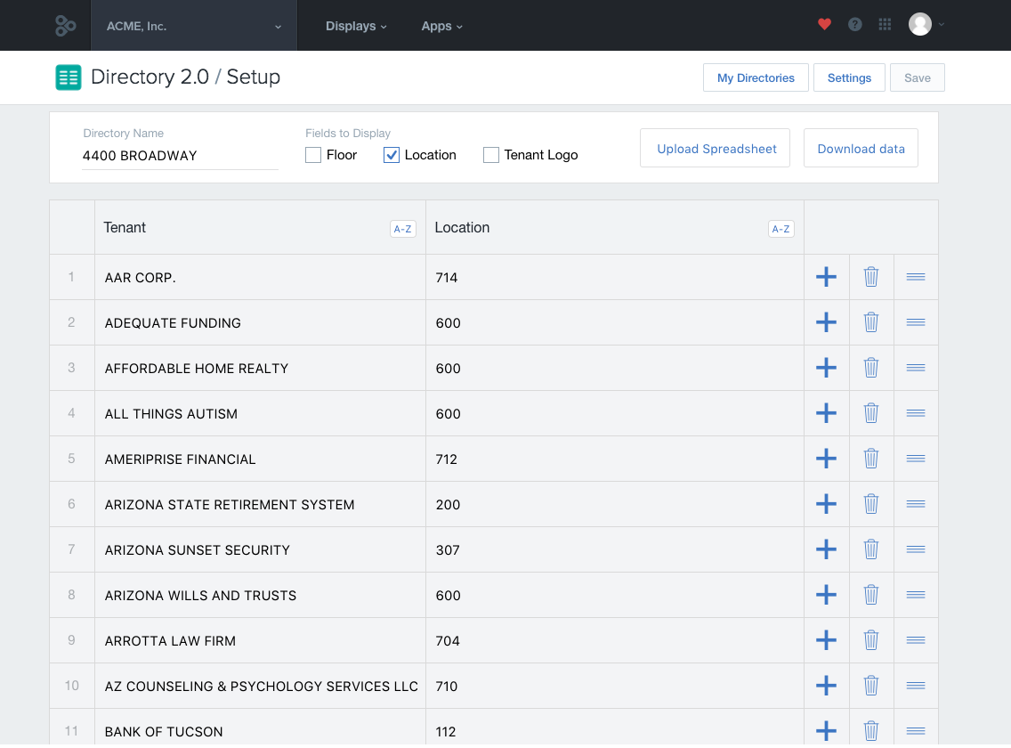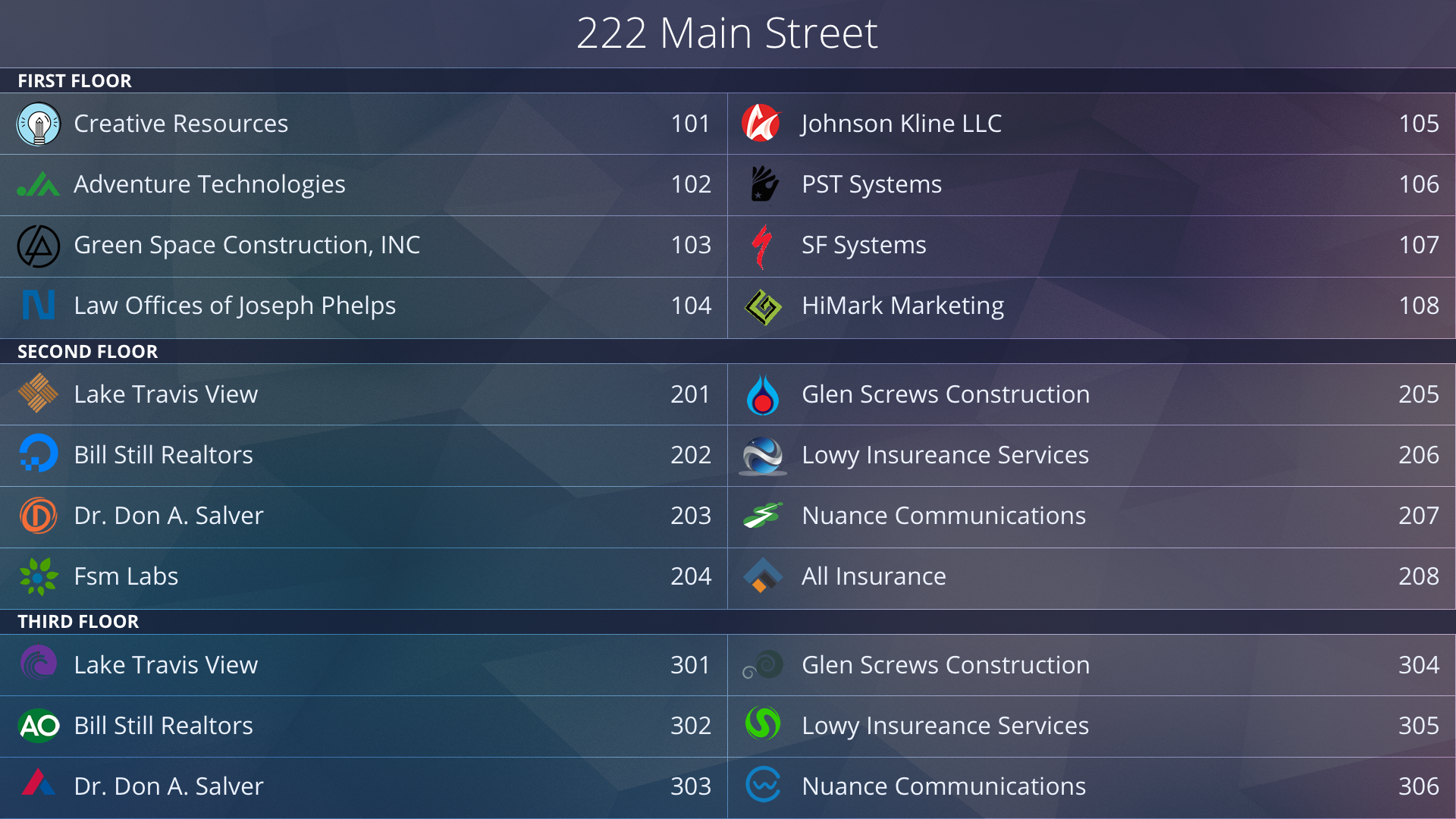 Do you have hundreds of tenant listings in your space? With the Directory App, you can create one directory and display it across multiple screens.