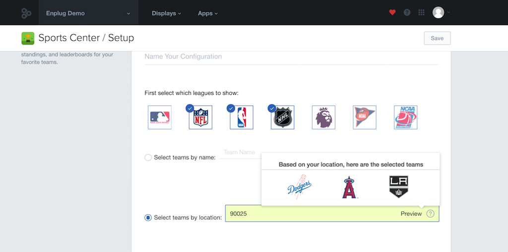 Sports Center allows you to display the latest stats and information from the teams your audience loves with the NFL, NBA, MLB, NHL, NCAA, and more.