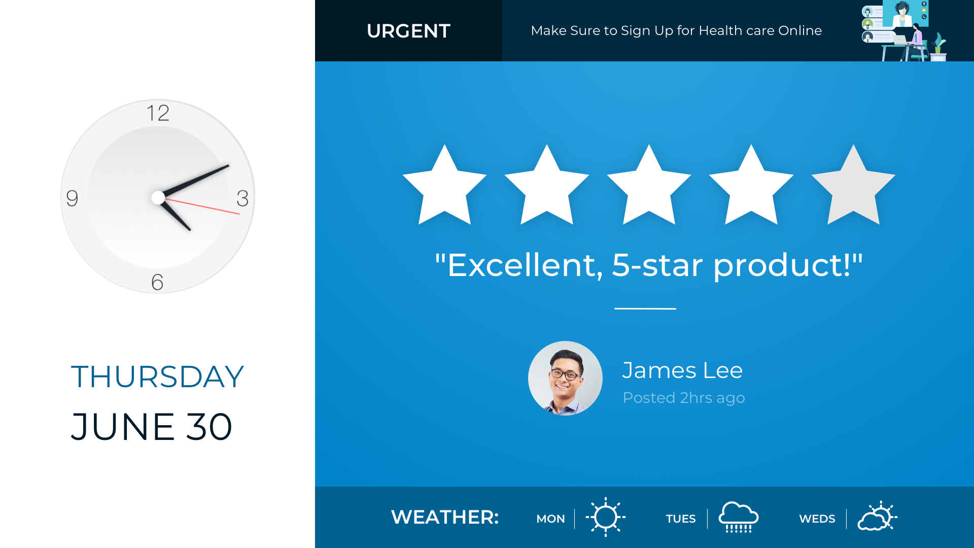 You can add a Banner to show multiple types of content on the left or right side of your digital signage displays. Or, add a Ticker to show a scrolling feed of text content along the top or bottom of your displays.