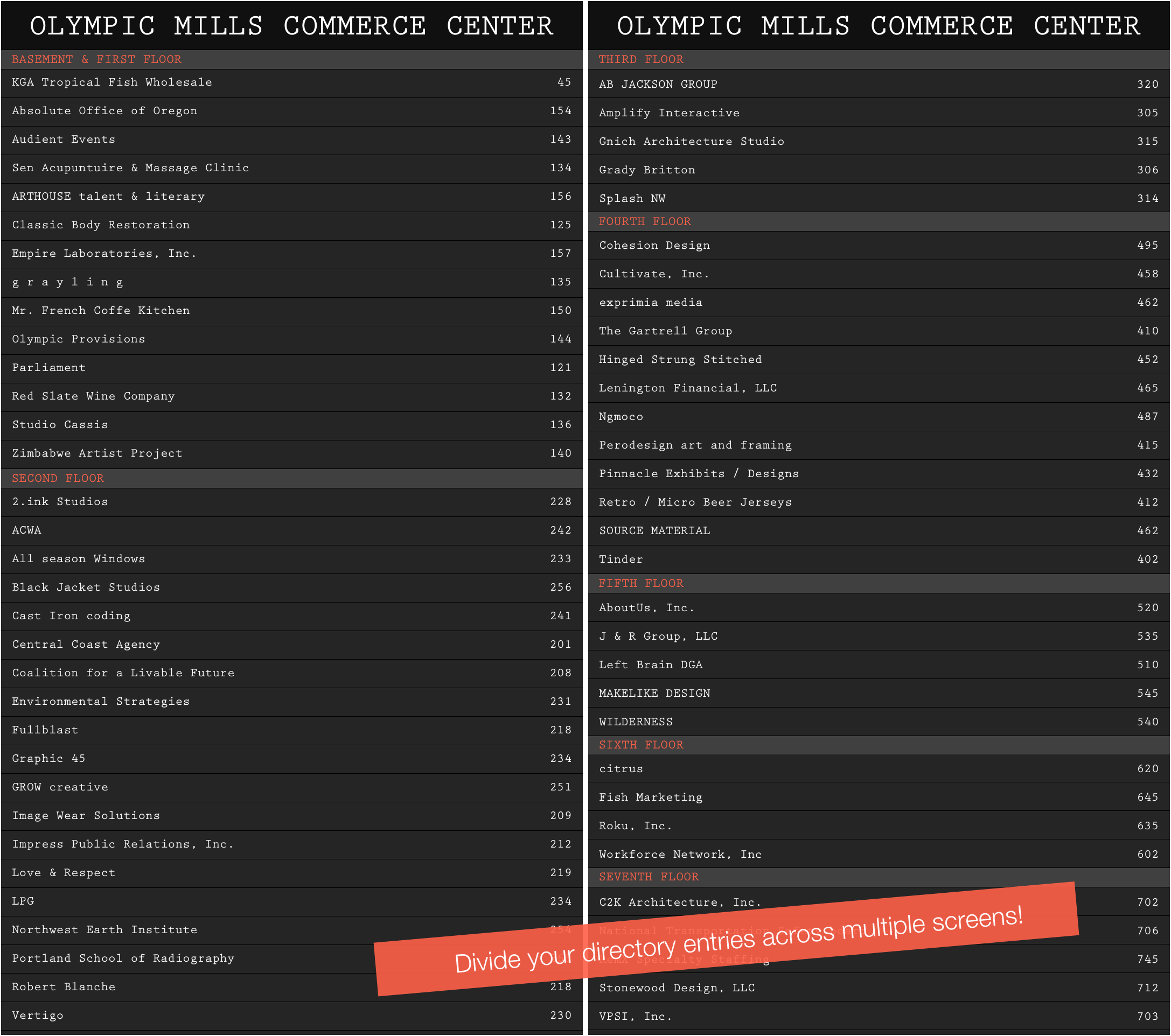 Do you have hundreds of tenant listings in your space? With the Directory App, you can create one directory and display it across multiple screens.